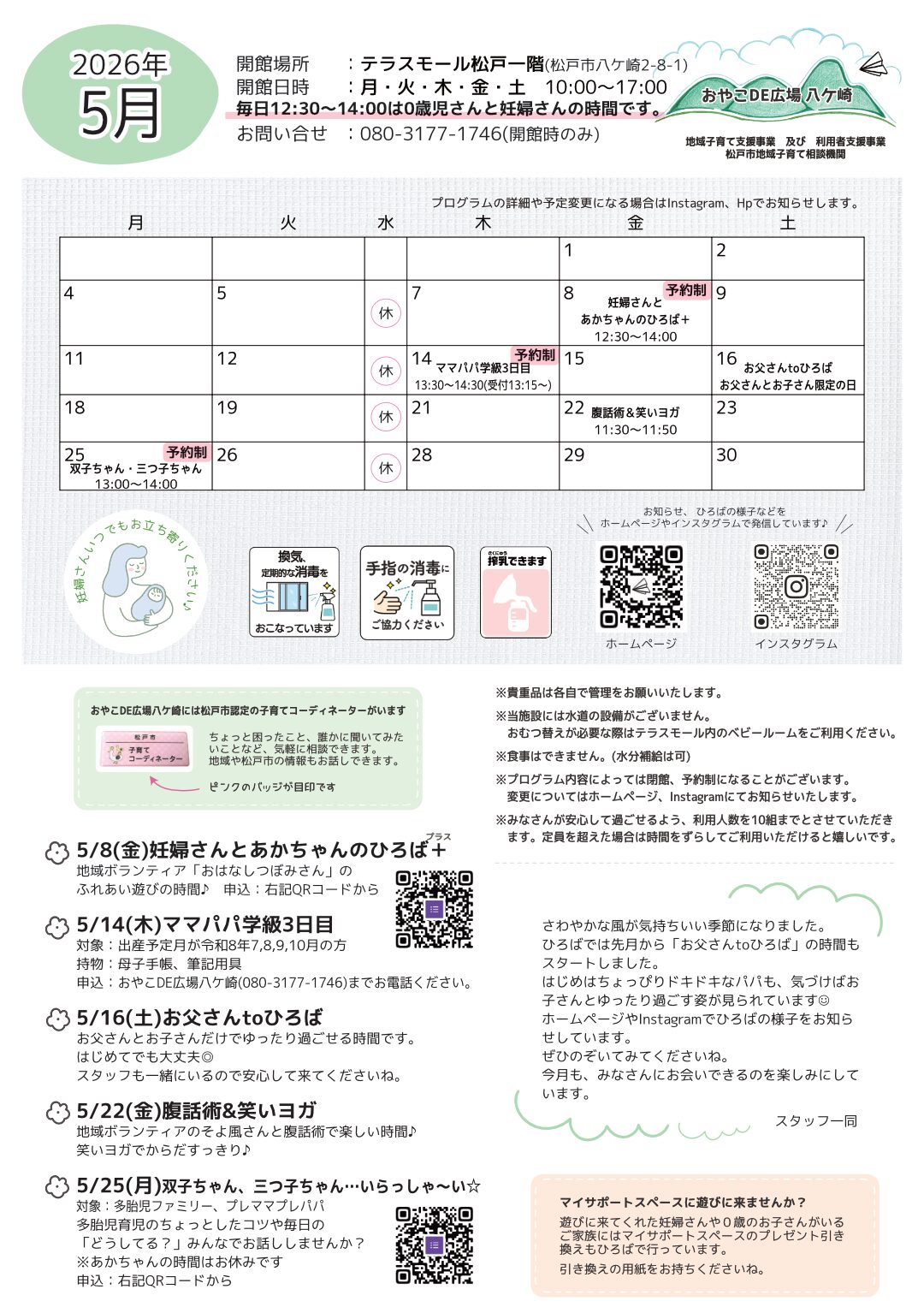 2026年4月21日 / 最終更新日時 : 2026年4月21日 おやこDE広場八ケ崎スタッフ お知らせ 5/14(木)「ママパパ学級3日目 」申込受付中です! ママパパ学級3日目をひろばで開催します♪ 参加申込受付中です! 【開催日時】5月14日(木) 13:30〜14:30(受付開13:15〜) 【対象】出産予定月が令和8年7.8.9.10月の方 【持ち物】母子手帳・筆記用具 […]